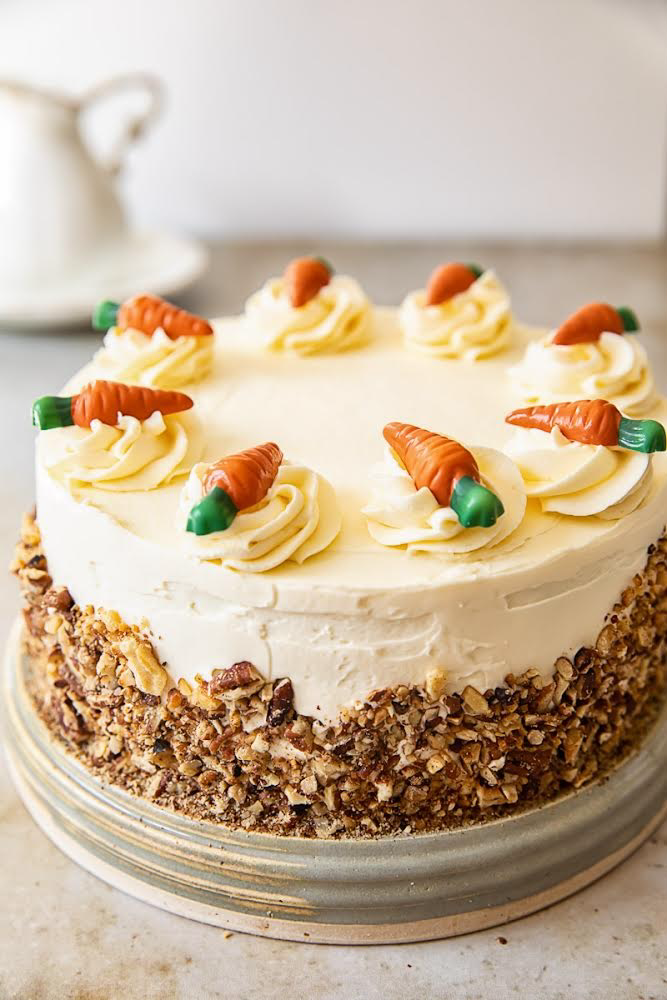 Carrot cake with butter cream icing With pecans toppings